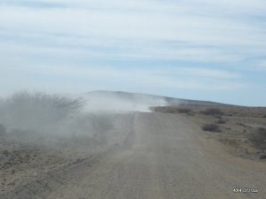 כמה עשרות קילומטרים ראשונים על כביש אספלט של ממש. אחר-כך מתחלף האספלט בדרך עפר מצופה מלח – הציפוי מבהיק, מעט חלקלק אבל אין אבק. הרדיו ברכב קולט כרגע כשש תחנות שונות. ויש עדיין קליטה סלולארית. אני חולף על פני אזור עבודות עפר וריכוז של משאיות כבדות ופונה ימינה, מזרחה, אל C28.